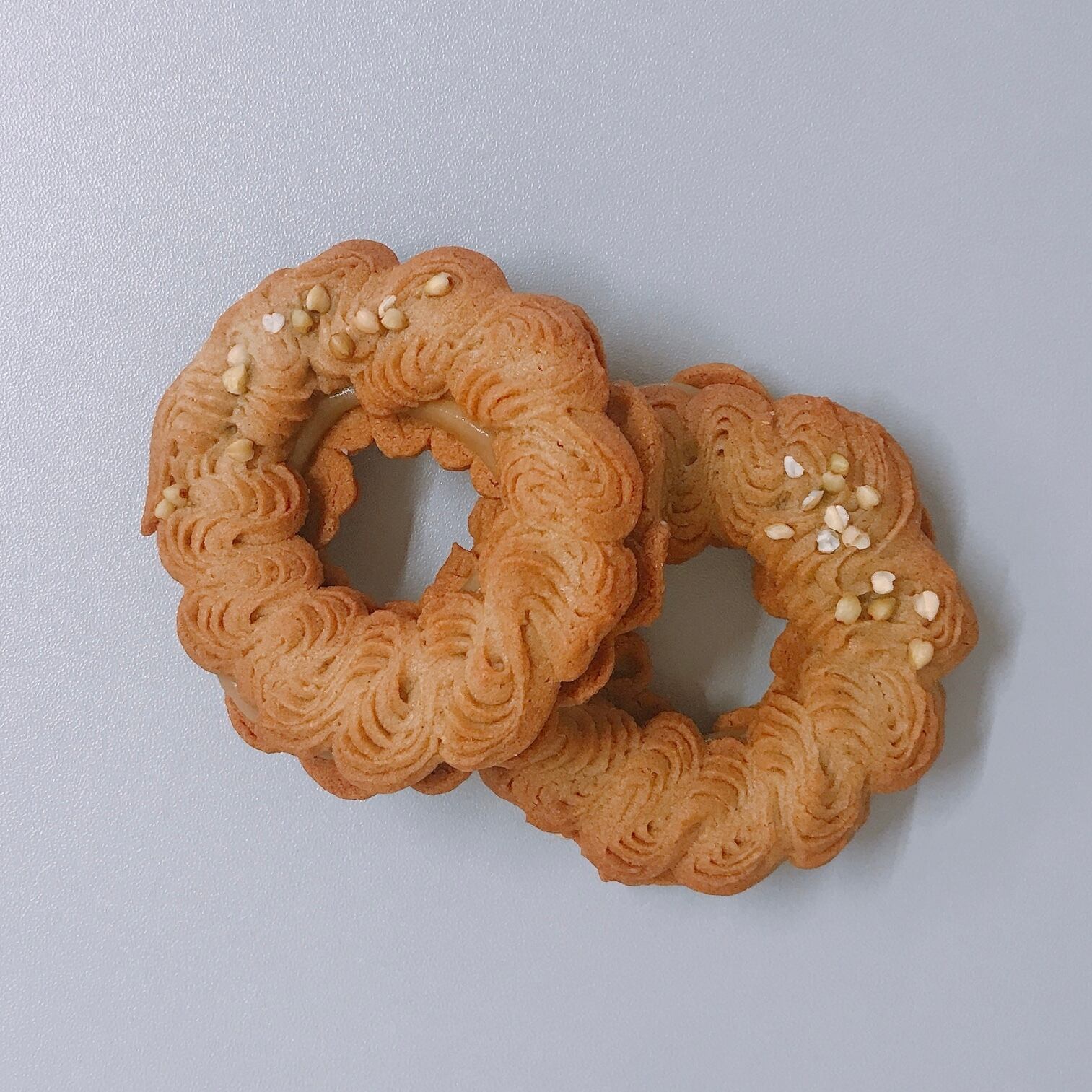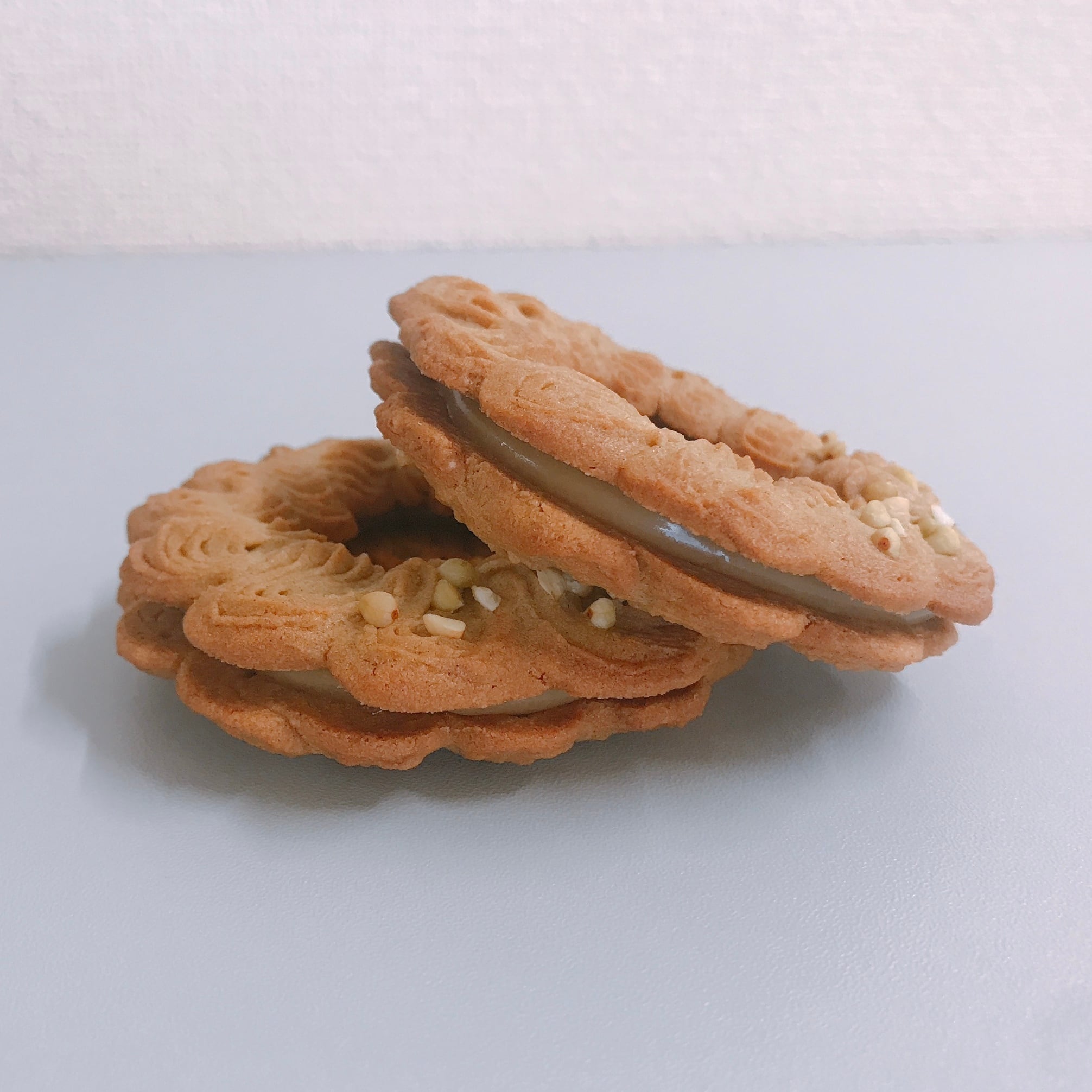 さっくりしたそば粉のクッキーで黒糖のキャラメルクリームをたっぷりサンドしました。